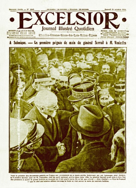 Ο Βενιζέλος μετακινείται από τα Χανιά στη Θεσσαλονίκη, όπου δημιουργεί την Προσωρινή Κυβέρνηση της Θεσσαλονίκης. Η πρώτη σελίδα του «Exelsior» που απεικονίζει την άφιξη του Βενιζέλου και την υποδοχή του από τον στρατηγό Sarrail, διοικητή του Armée d’ Orient. «Exelsior», Οκτώβριος 1916.