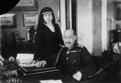 Ο βασιλιάς Κωνσταντίνος Α΄ της Ελλάδας στο γραφείο του, με τη βασίλισσα Σόφια την 1η Φεβρουαρίου 1921. Bibliothèque nationale de France.
