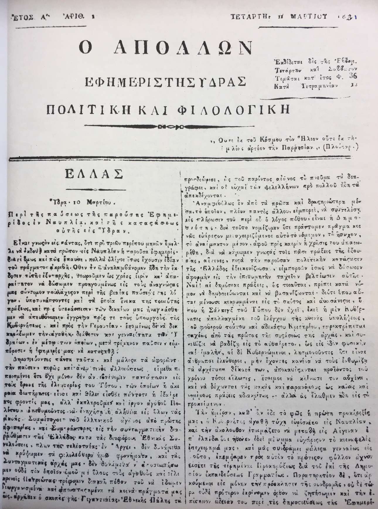 Το πρώτο φύλλο – 11 Μαρτίου 1831 – της αντιπολιτευόμενης τον Καποδίστρια εφημερίδας «Απόλλων».