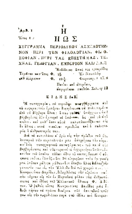 Η Ηώς, Σύγγραμμα περιοδικόν ασχολούμενον περί την φιλολογίαν, φιλοσοφίαν, περί τας επιστήμας, τέχνας, γεωργίαν, εμπόριον κ.λπ.