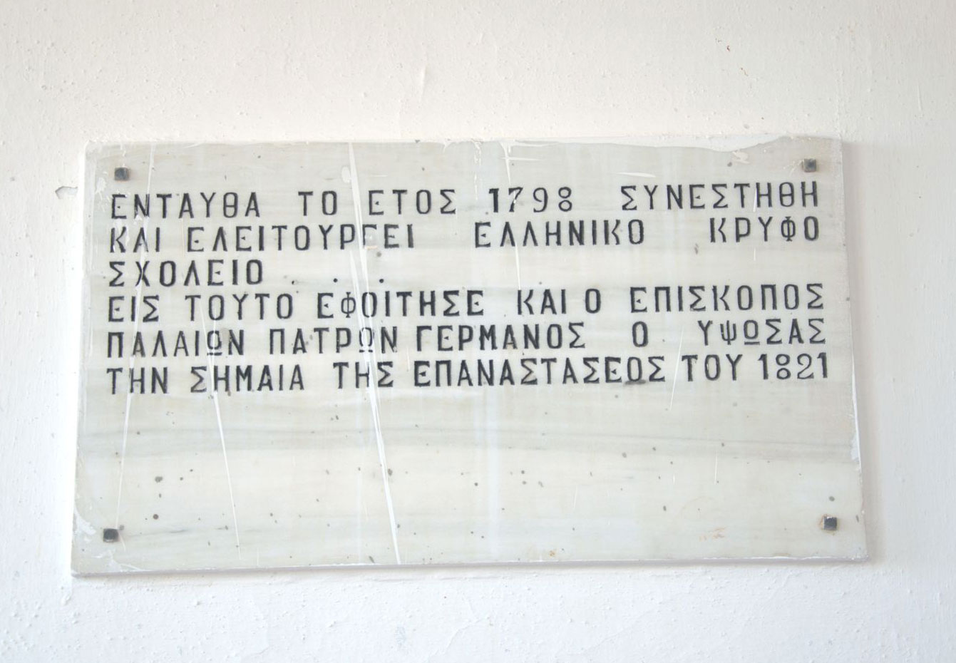 Η εντοιχισμένη μαρμάρινη πινακίδα στην είσοδο κάτω από την εκκλησία της Παναγίας.