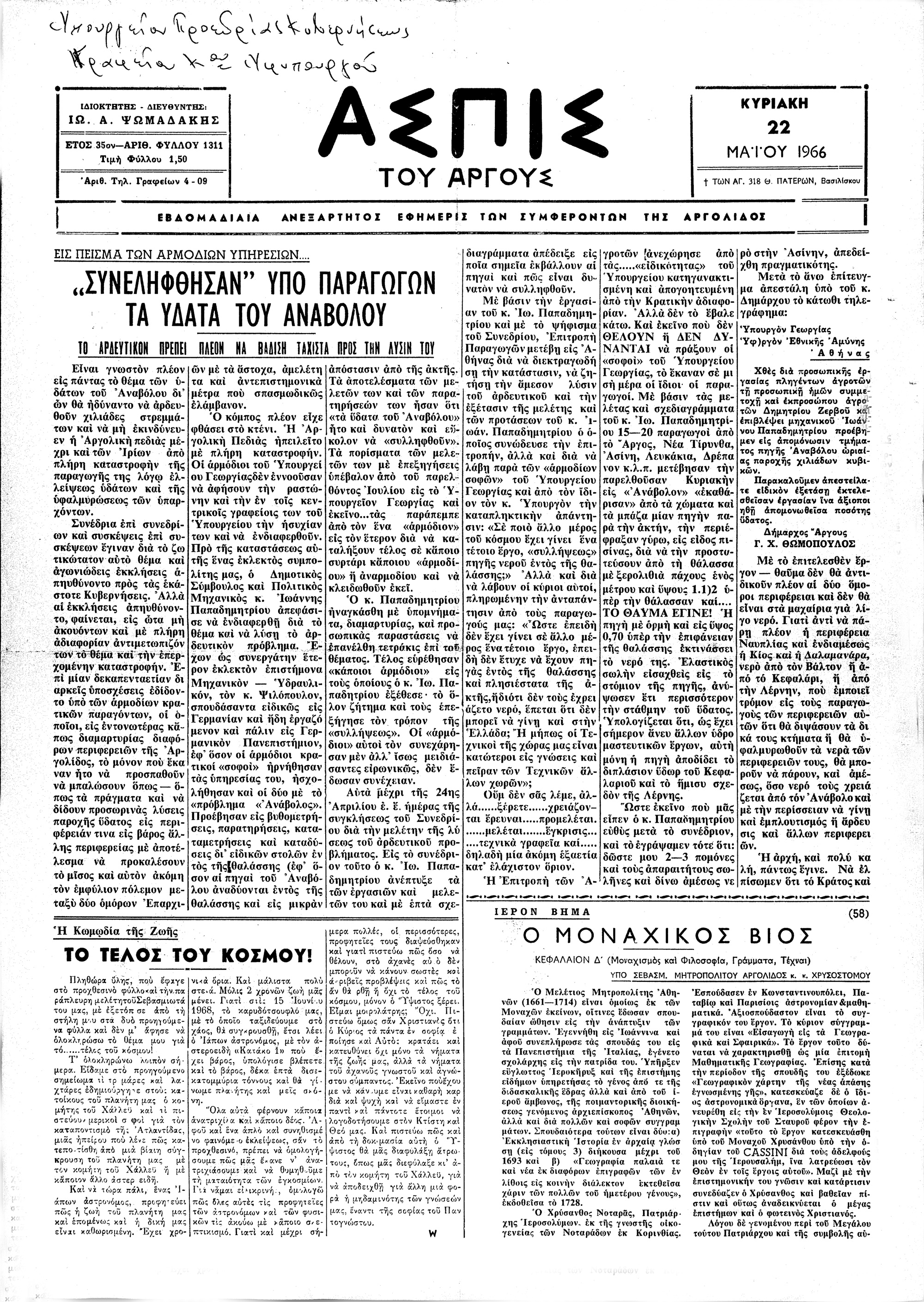 Ασπίς του Άργους, Αρ. Φύλλου 1311, 1966. Έτος Έκδοσης: 35ο. Τίτλοι πρώτης σελίδας: Εις πείσμα των αρμοδίων υπηρεσιών: «Συνελήφθησαν» υπό παραγωγών τα ύδατα του Αναβόλου – Η κωμωδία της ζωής, το τέλος του κόσμου! – Ιερόν βήμα, ο μοναχικός βίος.