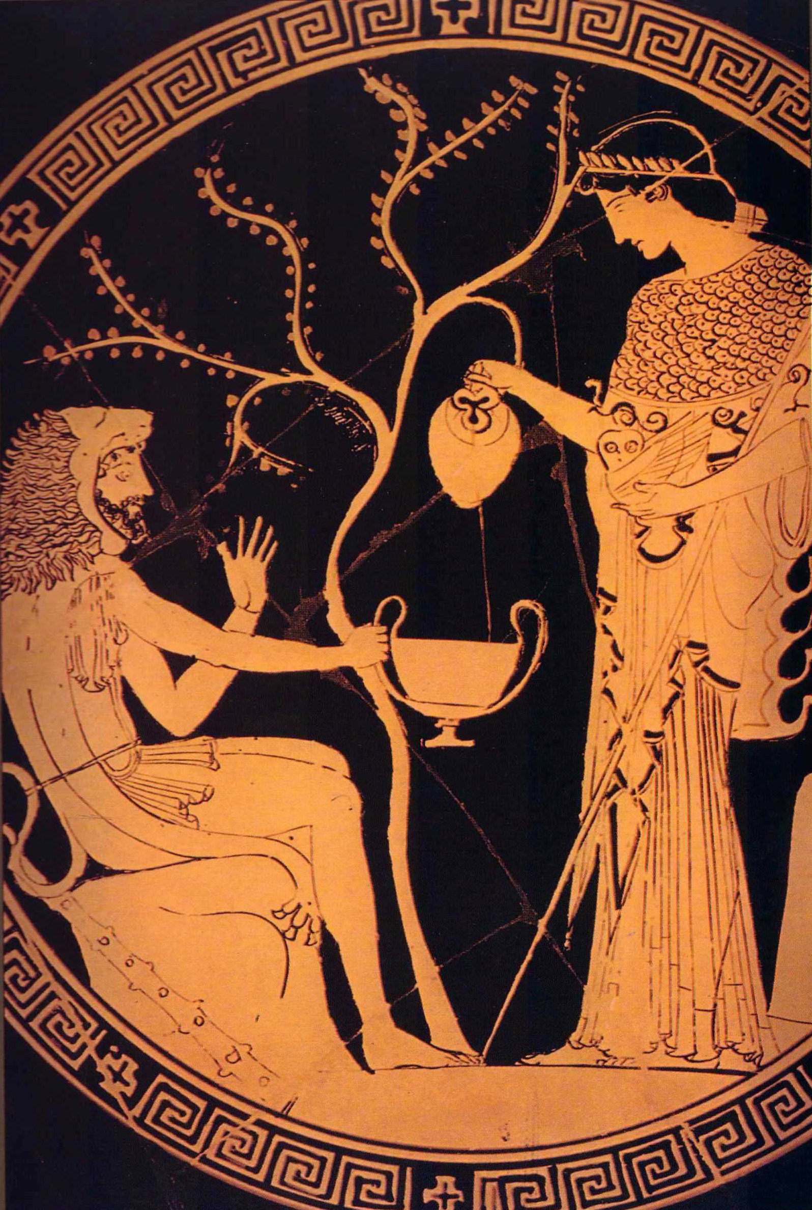 Ο Ηρακλής κουρασμένος ξαποσταίνει στον ίσκιο της Ελιάς. Η πιστή προστάτις του θεά Αθήνα γεμίζει κρασί το κύπελό του. Εσωτερικό ερυθρόμορφης κύλικας, 470 π.Χ, (Μόναχο).