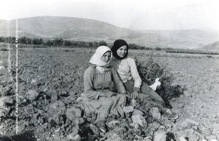 Φύτεμα καπνού. Οι δυο γυναίκες στη φωτογραφία (Αναστ. Αργύρη και η νύφη της Αναστ. Καραμάνου) σε ώρα διαλείμματος. Δημοσιεύεται στο: «Στα χνάρια του χθες», Εκδόσεις Εκ Προοιμίου, Άργος, 2010.