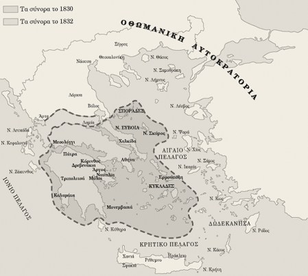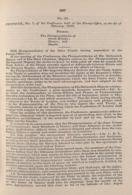 Η Ελλάς θέλει σχηματίσει εν κράτος ανεξάρτητον και θέλει χαίρει όλα τα δίκαια πολιτικά, διοικητικά και εμπορικά τα προσπεφυκότα εις εντελή ανεξαρτησίαν. [Πρωτόκολλο του Λονδίνου του 1830].