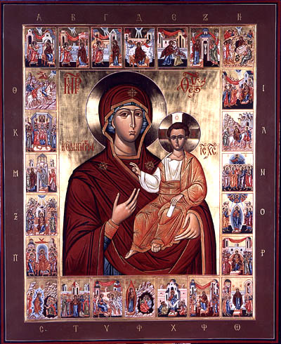 «Ο Ακάθιστος Ύμνος», ορθόδοξη εικόνα. Στο κέντρο εικονίζεται η Παναγία, ενώ καθεμιά από τις μικρές περιφερειακές εικόνες αφορά τη διήγηση ενός από τους 24 «οίκους» του Ακάθιστου Ύμνου. Holy Transfiguration Monastery (Brookline, Massachusetts).