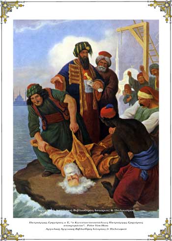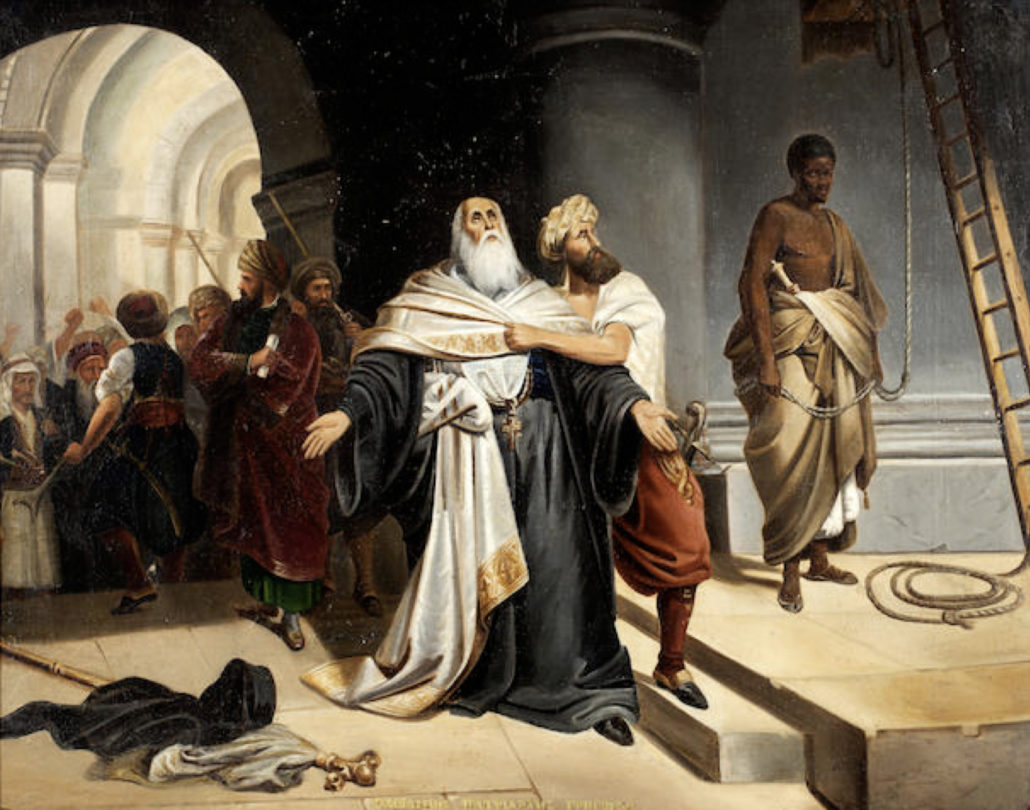 «Ο Πατριάρχης Γρηγόριος Ε΄ συρόμενος στην αγχόνη». Ελαιογραφία, έργο του Νικηφόρου Λύτρα (1832-1904).
