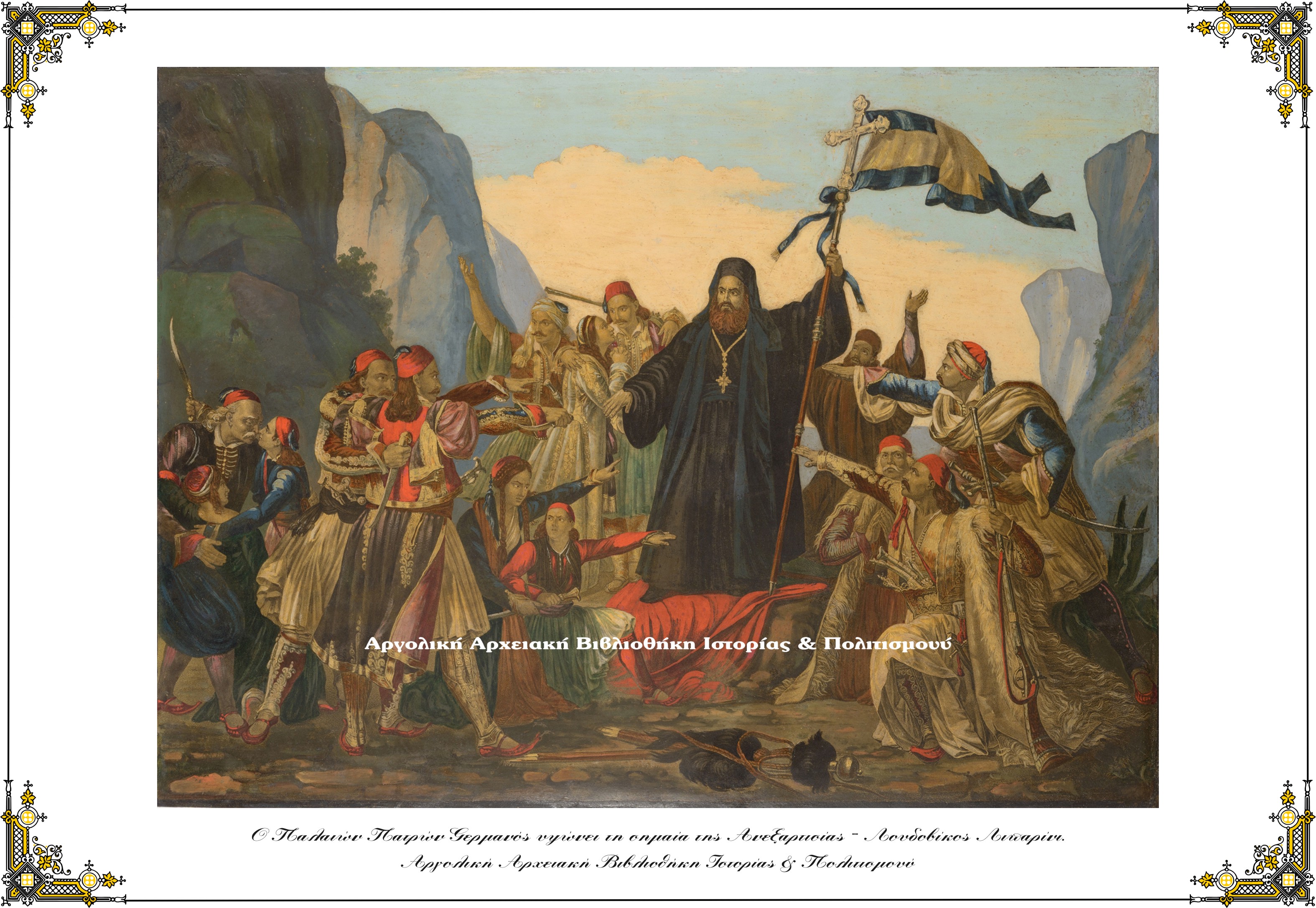 Ο Παλαιών Πατρών Γερμανός υψώνει τη σημαία της Ανεξαρτησίας στα Καλάβρυτα, έργο του Ιταλού καλλιτέχνη Λουδοβίκου Λιπαρίνι, (Ludovico Lipparini, 1800-1856), λιθογραφία, μέσα 19ου αιώνα.