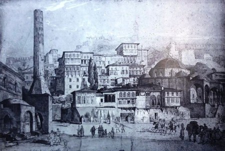 Εικόνα 1. L. Lange, Η πλατεία Πλατάνου (Συντάγματος) με την οικία του Μόρα/Αγά Πασά ψηλά στο βάθος και την οικία «Νικηταρά» πάνω στην πλατεία, και το μεγάλο τζαμί, το Βουλευτικό, 1834, μολύβι και υδατόχρωμα, Μόναχο, Staatliche Graphische Sammlung, inv. No. 35859. Δημοσιευμένο μεταξύ άλλων από Α. Κούρια, Το Ναύπλιο των περιηγητών, ό.π., εικ. αρ.111.