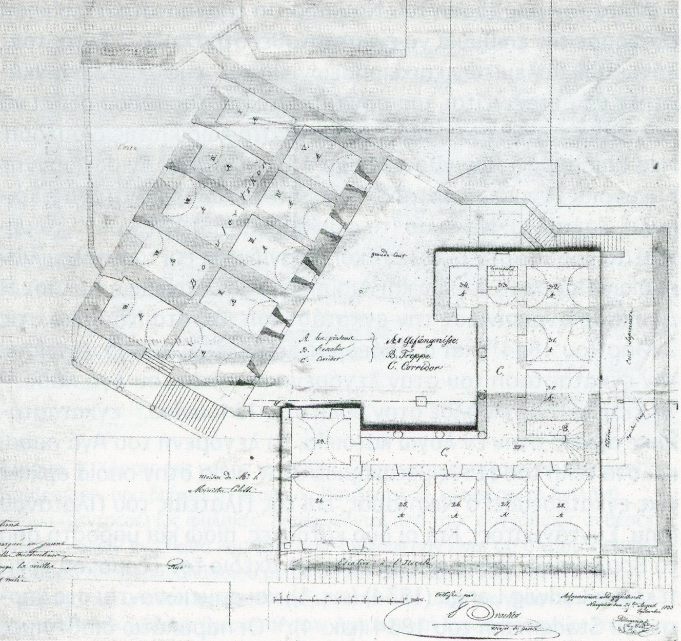 Το σχέδιο συνοδεύεται από ένα έγγραφο με ημερομηνία 14/26 Αυγούστου 1835, «επί της παραδόσεως της Δημοσίου Φυλακής, και των φυλακών των υποκάτωθεν του Βουλευτικού προς στην ενταύθα δικαστική Αρχήν». Το έγγραφο υποβλήθηκε από Επιτροπή με πρόεδρο τον Αρχηγό της Πλατείας κο Χένε και μέλη τον Υπολοχαγό κο Γρόσσμαν και τον Αξιωματικό του Μηχανικού κο Δίλλμαν. Το έγγραφο μας διαφωτίζει ιδιαίτερα για τη χωρική οργάνωση της φυλακής. Φανερώνει ότι όλα τα δωμάτια των σπουδαστών του μεντρεσέ μετασκευάστηκαν σε κελλιά κρατουμένων, μαζί με τα πρώην εργαστήρια/καταστήματα, καθώς και τη μετασκευή των μεγαλύτερων αιθουσών σε χώρους για τους δεσμοφύλακες ή για ανακρίσεις. Στον ίδιο φάκελο του αρχείου συμπεριλαμβάνονται αναλυτικά προγράμματα εργασιών, αποδείξεις πληρωμών των επιστατών και των οικοδόμων που απασχολήθηκαν στις εργασίες, που είχαν ξεκινήσει τον Μάρτιο του 1834.