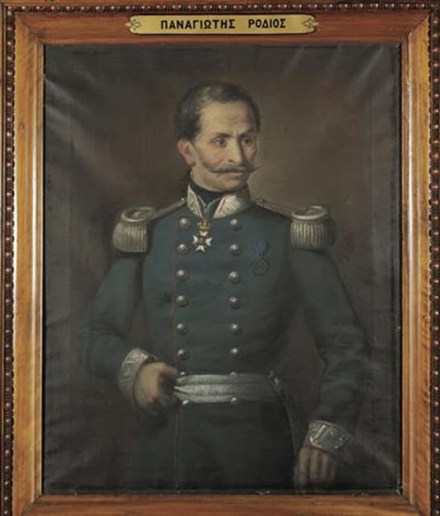 Παναγιώτης Ρόδιος (Ρόδος, 1789 – Ναύπλιο, 1851) αγωνιστής του 1821, πολιτικός και συγγραφέας. Με το κίνημα της 3ης Σεπτεμβρίου διορίστηκε στρατιωτικός διοικητής Αργολίδος και ήταν πληρεξούσιος Ναυπλίου στην Εθνοσυνέλευση του 1843 όπου εκλέχτηκε μέλος της συντακτικής Επιτροπής του Συντάγματος. Εθνικό Ιστορικό Μουσείο.