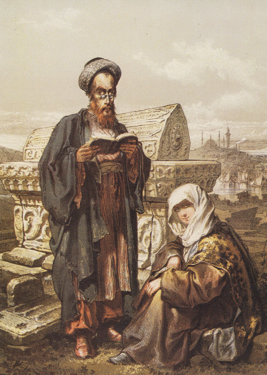 Εβραία, φορώντας μακραμά (μαντήλι) και φερετζέ (μακρύ ένδυμα που καλύπτει όλο το σώμα) κάθεται κοντά σε τάφο του 16ου αι. με έναν χαχάμ να διαβάζει προσευχές. Φανταστική σκηνή στο Κοιμητήριο Κασίμ Πασά στην Κωνσταντινούπολη. Λιθογραφία, Εβραϊκό Μουσείο Ελλάδας.