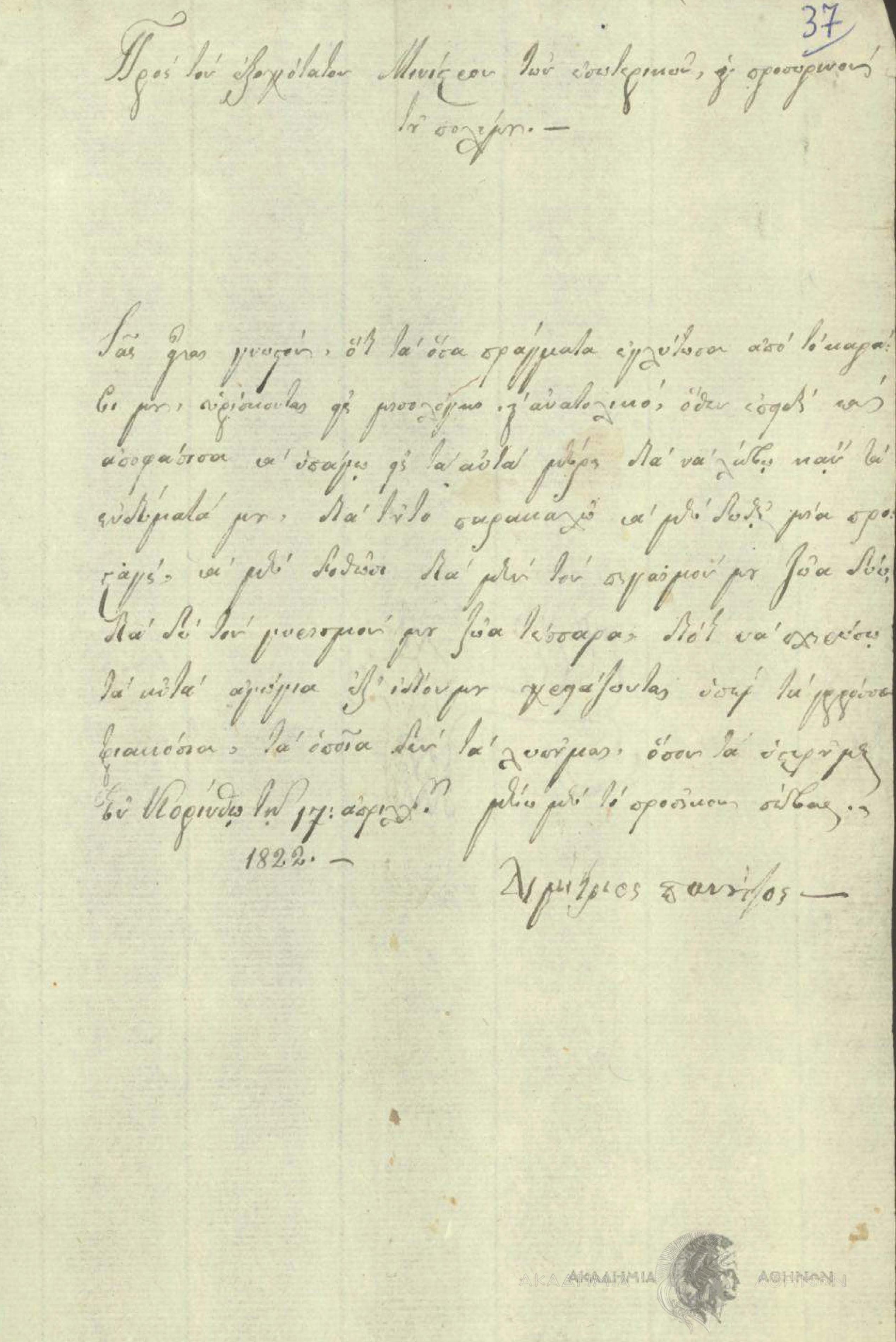 Δημήτριος Πανούτζος προς [Ιωάννη Κωλέττη], 1822 Απριλίου 17. Ο Δημήτριος Πανούτζος ζητάει από τον Ιωάννη Κωλέττη να του παραχωρήσει τα μέσα μεταφοράς και τα χρήματα για να πάει στο Μεσολόγγι και το Ανατολικό και να περισώσει όσα από τα πράγματά του μπορεί.