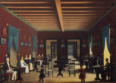 Αίθουσα συναθροίσεων. 19ος αι. Αριστερά εικονίζεται ο Ιωάννης Καποδίστριας, καθώς ένα παιδί του παραδίδει το στεφάνι της δόξας και ένα άλλο κρατά την πλάστιγγα της Δικαιοσύνης. Μεταξύ των παρευρισκομένων, οι οποίοι φορούν ευρωπαϊκές ενδυμασίες, διακρίνεται ένας με στολή εύζωνα. Άγνωστος καλλιτέχνης. λάδι σε μουσαμά, 71×98,5 εκ. Συλλογή Διονύση Φωτόπουλου.