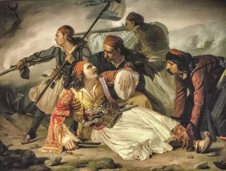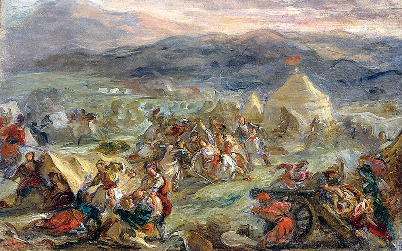 «O Μπότσαρης αιφνιδιάζει το στρατόπεδο των Τούρκων και τραυματίζεται θανάσιμα» (1860-1862), του Ευγένιου Ντελακρουά. Λάδι σε καμβά, 65χ73 εκ. Toledo Museum of Art (Ohio, USA).