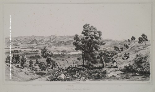 Τοπίο στην Ολυμπία. Στο βάθος ο Αλφειός ποταμός. Δημοσιεύεται στο: STACKELBERG, Otto Magnus Baron de, «La Grèce. Vues Pittoresques et Topographiques», Παρίσι [Λονδίνο], 1830. Συλλογή: Βιβλιοθήκη Ιδρύματος Αικατερίνης Λασκαρίδη.