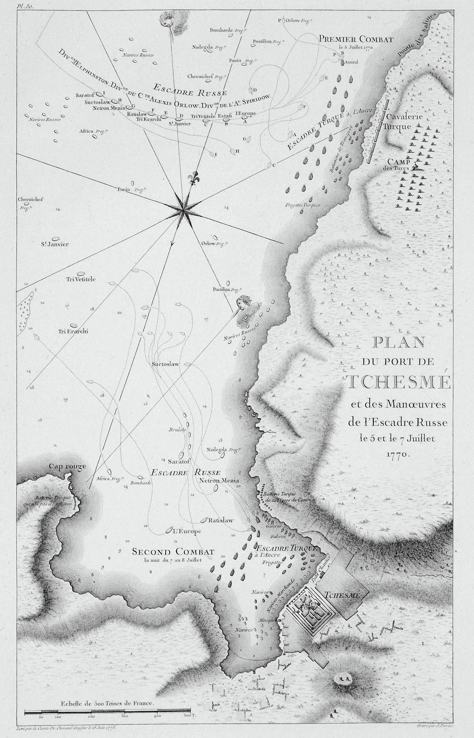 Χάρτης του λιμανιού της Κρήνης (σήμερα Τσεσμέ) όπου επισημαίνονται οι ελιγμοί του ρωσικού στόλου κατά τη ναυμαχία της 7ης Ιουλίου 1770. CHOISEUL-GOUFFIER, Gabriel Florent Auguste de. Voyage pittoresque de la Grèce. Παρίσι, J.-J. Blaise M.DCC.LXXXII, [=1782]. Συλλογή: Βιβλιοθήκη Ιδρύματος Αικατερίνης Λασκαρίδη.