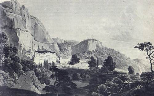 Μέγα Σπήλαιο το ιστορικό μοναστήρι των Καλαβρύτων. Dodwell «Views in Greece from drawings», 1801-1806.