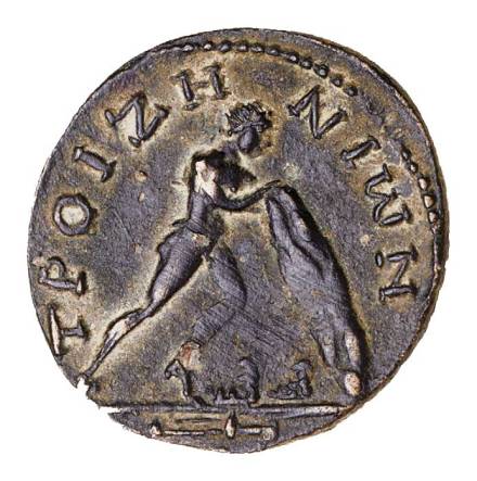 Χάλκινο νόμισμα της Τροιζήνας που απεικονίζει τον Θησέα να ανασηκώνει το βράχο για να πάρει τα σανδάλια και το ξίφος του Αιγέα (2ος–3ος αι. μ.Χ.).