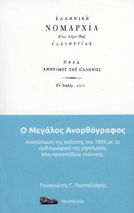 Κυκλοφορεί το νέο βιβλίο του Ναυπλιώτη ιστορικού Παναγιώτη Πασπαλιάρη με τίτλο: «Ο Μεγάλος Ανορθόγραφος – Ελληνική Νομαρχία. Ανατύπωση της έκδοσης του 1806 με τα ορθογραφικά της σφάλματα. Μια προσπάθεια ταύτισης», εκδόσεις «Ναυπλιεύς».