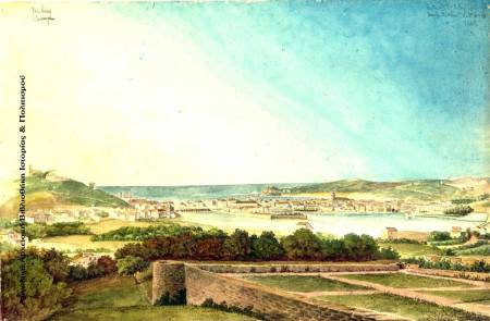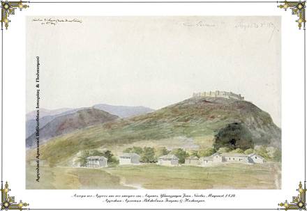 Άποψη του Άργους και του κάστρου της Λάρισας. Υδατογραφία του Ζαν Νικολά Μακάρ (Jean Nicolas Maquart), 1829. Δημοσιεύεται στο: «Το ταξίδι του Συνταγματάρχη Jean Nicolas Maquart στην επαναστατημένη Ελλάδα (Πελοπόννησος 1828-1831)» – Γεώργιος Η. Κόνδης – Yves Ollivier.