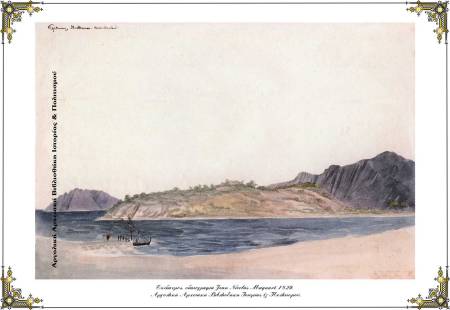Επίδαυρος, υδατογραφία του Ζαν Νικολά Μακάρ (Jean Nicolas Maquart), 1829. Δημοσιεύεται στο: «Το ταξίδι του Συνταγματάρχη Jean Nicolas Maquart στην επαναστατημένη Ελλάδα (Πελοπόννησος 1828-1831)» – Γεώργιος Η. Κόνδης – Yves Ollivier. Στην Επίδαυρο αποτυπώνει τη δεξαμενή στο Ιερό [του Απόλλωνα Μαλεάτα] και το λιμάνι της Επιδαύρου έχοντας στο βάθος τα βουνά των Μεθάνων. Το Μαύρο χρώμα των βουνών παραπέμπει στο ηφαίστειο των Μεθάνων.