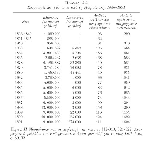 Πίνακας 14.4 – Εισαγωγές και εξαγωγές από τη Μαριούπολη, 1836-1891.