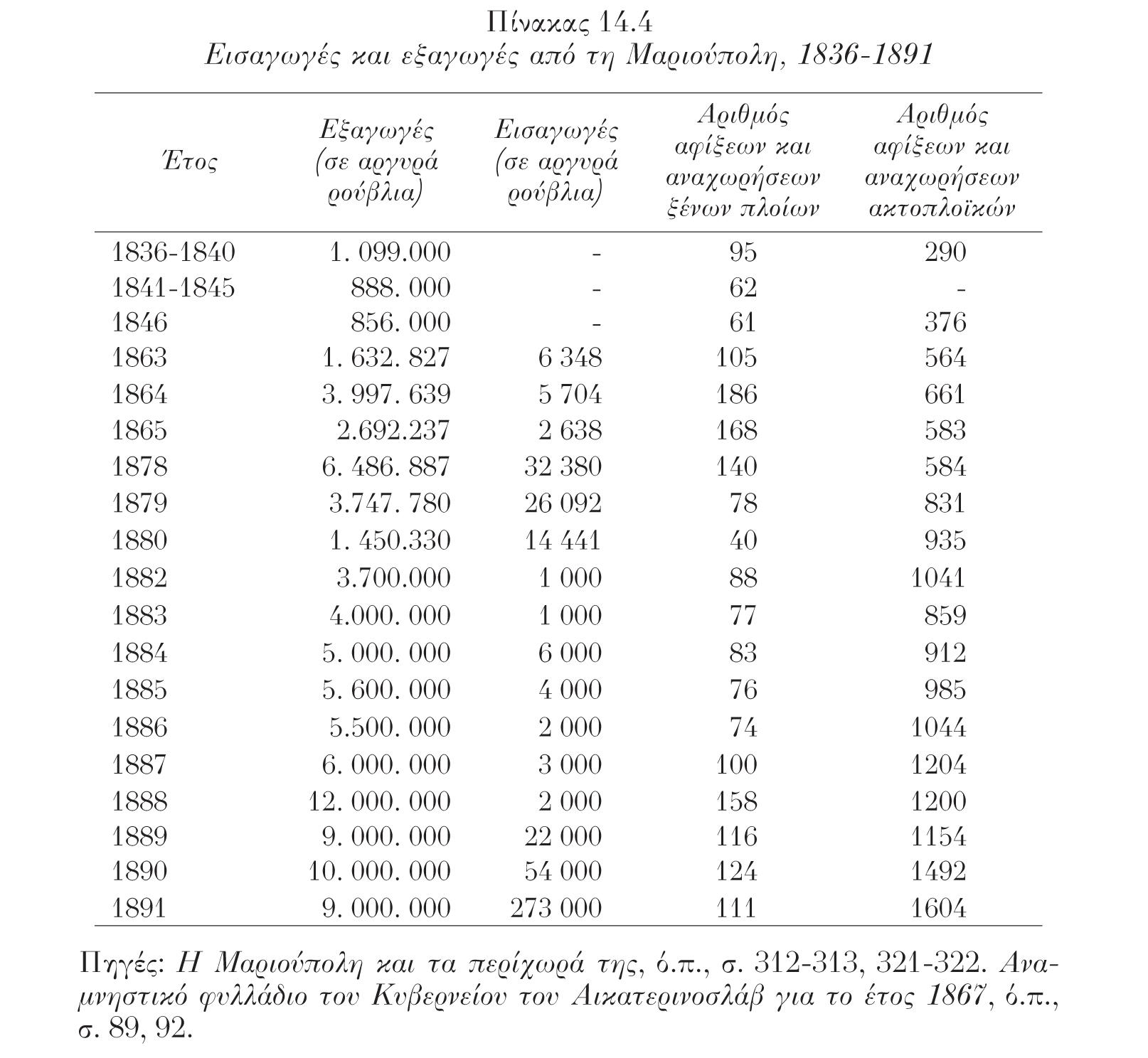 Πίνακας 14.4 – Εισαγωγές και εξαγωγές από τη Μαριούπολη, 1836-1891.