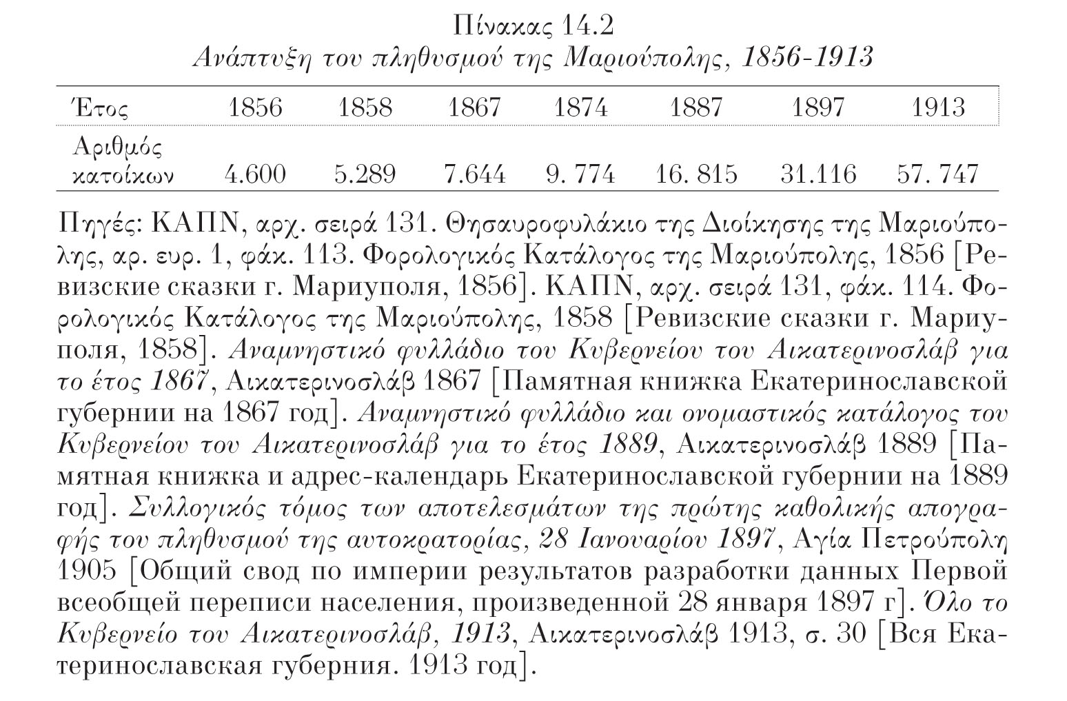 Πίνακας 14.2 – Ανάπτυξη του πληθυσμού της Μαριούπολης, 1856-1913.