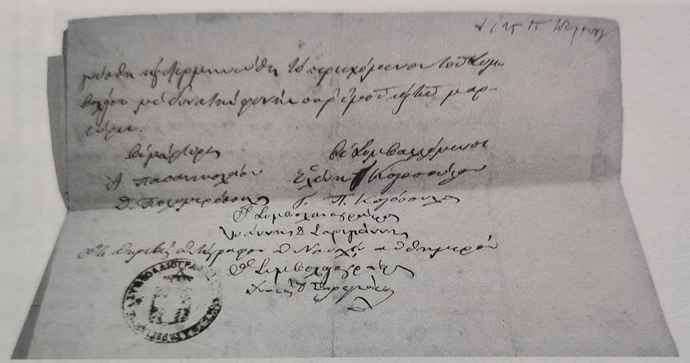 Υπογραφή και σφραγίδα Ιωάννη Δ. Σαριγιάννη (1869). Προσωπικό αρχείο των κυριών Αλεξάνδρας και Σοφίας Βουδρισλή.