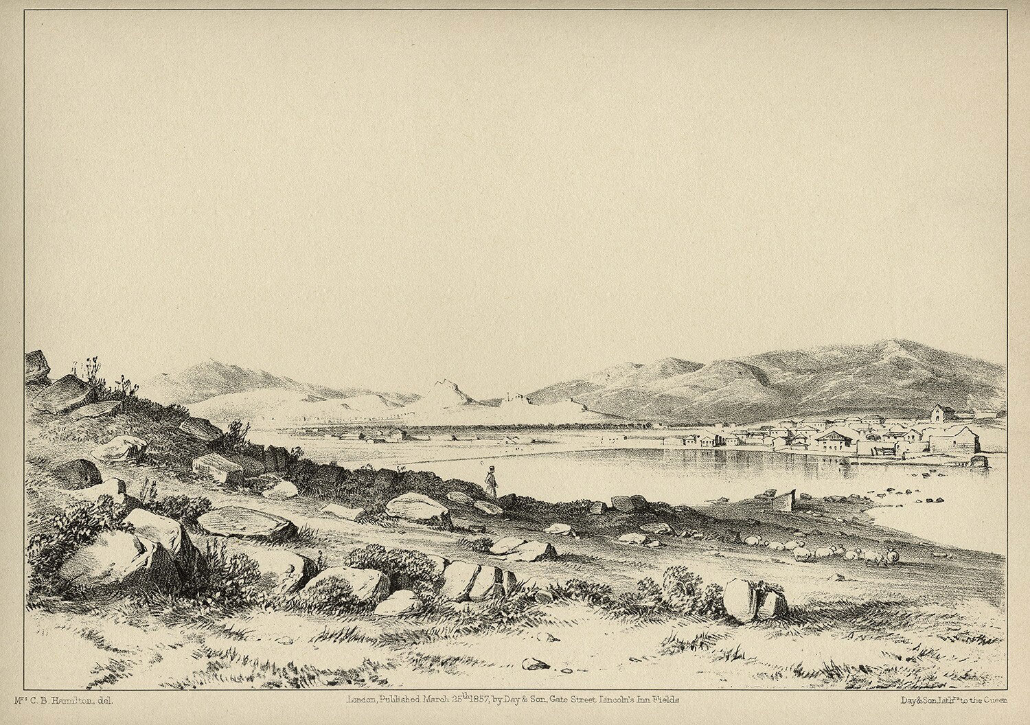 Ο νεογέννητος Πειραιάς σε μια λιθογραφία που τυπώθηκε στο Λονδίνο τον Μάρτιο του 1857. Η αγαπημένη θέση των περιηγητών ήταν ο λόφος με τις αρχαίες πέτρες της Ηετιώνειας. Απέναντί τους είχαν τον πρώτο πυρήνα της πόλης και στο βάθος, στα βόρεια, το «Χωρίον Μελετοπούλου, τον Ελαιώνα και τους λόφους της Αθήνας με δεσπόζουσα την Ακρόπολη. Ψηφιακή συλλογή Γιώργου Βεράνη. Δημοσιεύεται στο: Νίκος Μπε-λαβίλας, «Ιστορία της πόλης του Πειραιά, 19ος και 20ός αιώνας», εκδόσεις Αλεξάνδρεια.