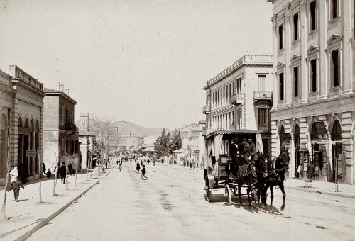Πειραιάς. Η σημερινή Λεωφόρος Γεωργίου Α’ από τη διασταύρωση με την τότε Σωκράτους, σημερινή Ηρώ-ων Πολυτεχνείου. Στο άκρο δεξιά το Δημοτικό Θέατρο Πειραιώς, που είχε εγκαινιαστεί μόλις το 1895. Στο βάθος αριστερά το «Ρολόι», το παλιό Δημαρχείο του Πειραιά…