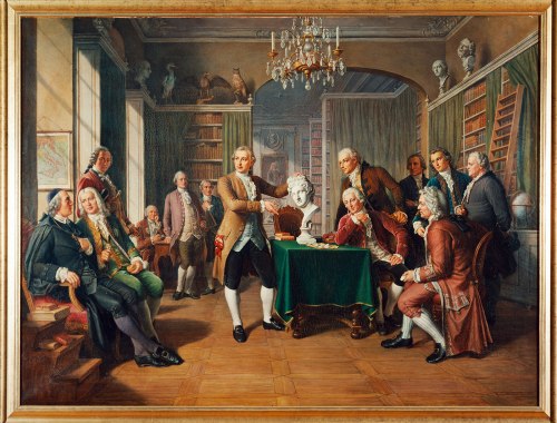Ο Winckelmann στον κύκλο των μελετητών στη βιβλιοθήκη του Κάστρου Nöthnitz, 1874, έργο του Γερμανού ζωγράφου, εικονογράφου και χαρακτή, Theobald Reinhold Freiherr von Oer (1807-1885).