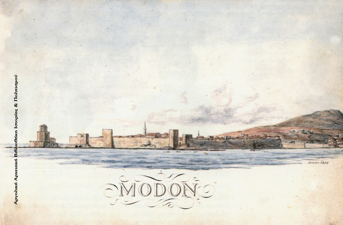 Άποψη της Μεθώνης από τη θάλασσα. Frederik von Scholten, ακουαρέλα, Οκτώβριος του 1825.