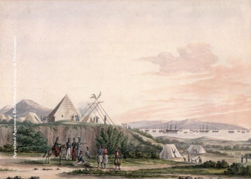 Στρατόπεδο κοντά στο Ναυαρίνο, ένα περίπου χρόνο μετά τη ναυμαχία. Φαίνονται στρατιώτες που στήνουν σκηνές και στο βάθος βλέπουμε τον κόλπο με σκάφη του ναυτικού. Υδατογραφία, Frederik von Scholten, 1828.