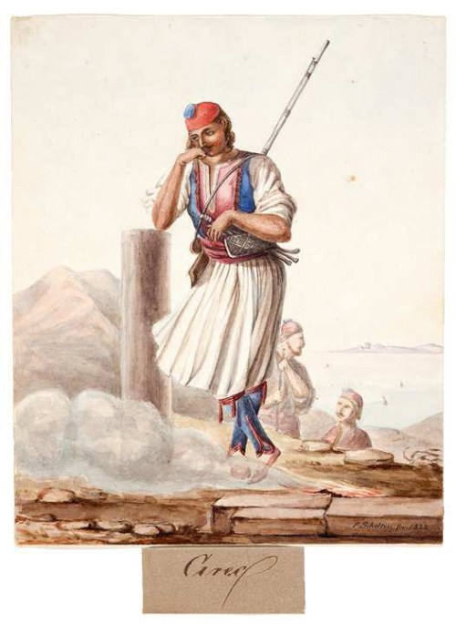 Ακουαρέλα που δείχνει έναν Έλληνα, υπογεγραμμένη από τον von Scholten το 1828.