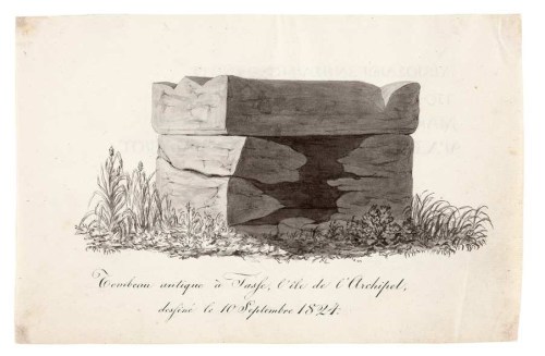 Δύο ρωμαϊκές σαρκοφάγοι που σχεδίασε ο von Scholten στη Θάσο. Ένα από τα σχέδια χρονολογείται στις 10 Σεπτεμβρίου 1824.