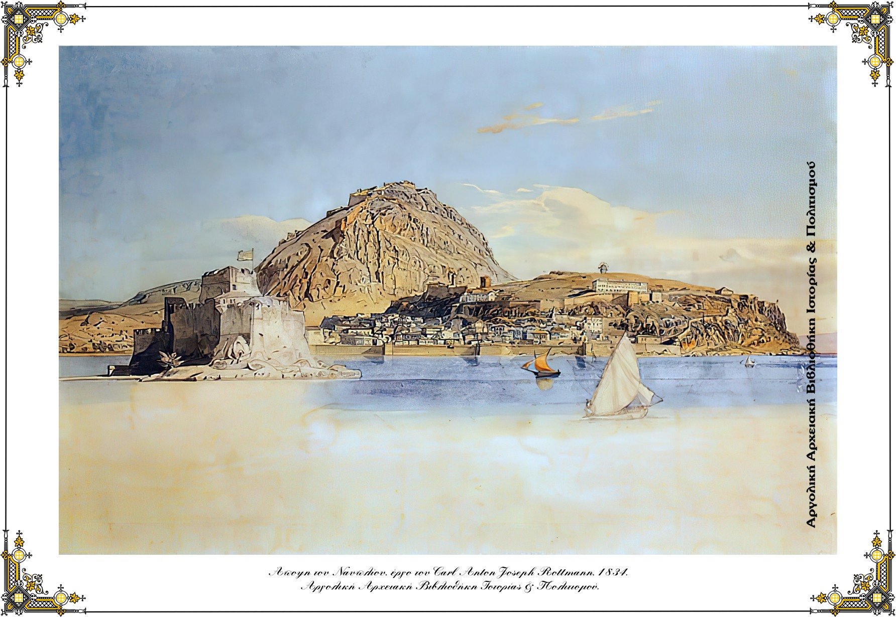 βλέπουμε το λιμάνι, το Μπούρτζι, τα κτίρια και τα κάστρα τ’ Αναπλιού. Έργο του Γερμανού ζωγράφου Carl Anton Joseph Rottmann, περίπου το 1834.