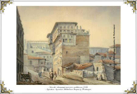 Ναύπλιο, ακουαρέλα αγνώστου καλλιτέχνη, 1849. Στο κέντρο πολυώροφο οθωμανικό σπίτι, αριστερά η πίσω πλευρά του Αρχαιολογικού Μουσείου. Ψηλά η Πύλη του Σαγρέδου.