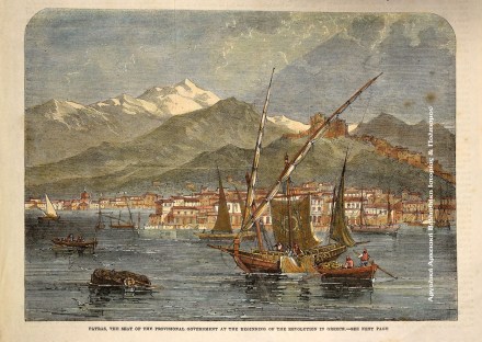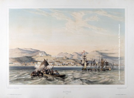 Συμπλοκή στα ανοιχτά της Πάτρας – Du Moncel, 1845. Ατμοσφαιρική λιθογραφία στην οποία η αραιή χρήση του χρώματος δίνει βάθος στο τοπίο. Δημοσιεύεται στο: Du Moncel, De Venise a Constantinople a travers la Grèce et Retour par Malte, Messine, Pizzo et Naples. Paris, [c.1845].