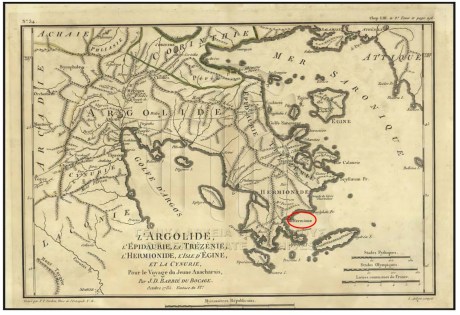 Χάρτης από το βιβλίο «Περιήγησις του Νέου Αναχάρσιδος εις την Ελλάδα», Παρίσι 1788, του Γάλλου συγγραφέα και νομισματολόγου Jean-Jacques Barthélemy (Ζαν-Ζακ Μπαρτελεμύ, 1716-1795).