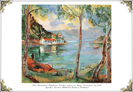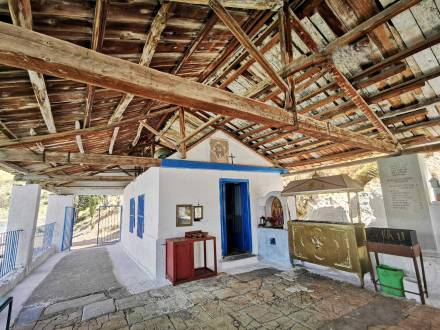 Ένα λευκό διώροφο σπίτι – ξενώνας με χαγιάτι υψώνεται λίγα μέτρα πιο πάνω, ανοιχτόκαρδο. Δίπλα στο ιερό – μινιατούρα, ένα ψηλόκορμο κυπαρίσσι. Δυο φουντωμένοι ευκάλυπτοι μαλακώνουν το φόντο της γυμνής ράχης, πίσω. Πιο μακριά, το εκκλησάκι του Άη Νικόλα.