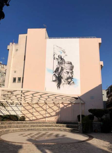 Ο τοίχος της Βιβλιοθήκης της Τριπόλεως με την απεικόνιση του Αρχιστράτηγου Θ. Κολοκοτρώνη και του Π. Κεφάλα.