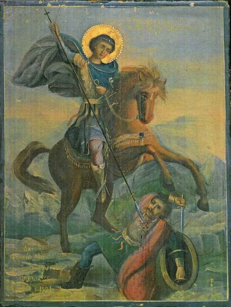 Η εικόνα του Αγίου Δημητρίου, που αφιέρωσαν οι γονείς του και αποτέλεσε «μάταιο» τάμα για την υγεία του. Στο κάτω μέρος της εικόνας αναγράφεται η φράση: «Δαπάνη Προκοπίου Ηλιού του υιού αυτού Δημητρίου, 1921».