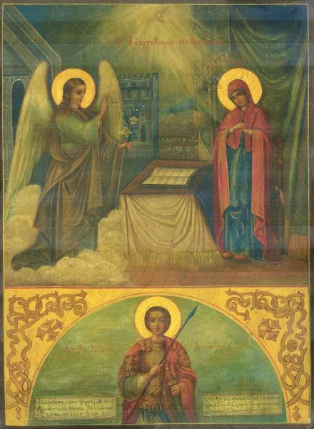 Η διπλή εικόνα, που παραγγέλθηκε στο Άγιο Όρος, ως αφιέρωση των γονιών του για τη γέννησή του. Στην εικόνα αυτή απεικονίζονται στο επάνω μέρος ο Ευαγγελισμός της Θεοτόκου και στο κάτω ο Άγιος Οσιομάρτυρας Προκόπιος. Στην αφιέρωση της εικόνας μπορούμε να διαβάσουμε: «Η παρούσα εικών έζωγραφήθη εν τώ Αγίω Ορει του Άθωνος δια χειρός Αβραμίου Μοναχού Σεραφείμ Ιερομονάχου, δια συνδρομής του κυρίου Προκοπίου εκ της πόλεως Κρανιδίου, Εν τη ιερά Νέα σκήτη τη 2 Ιουλίου 1885».