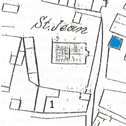 Εικ. 3: Απόσπασμα πρώτου καποδιστριακού σχεδίου 1829, περιοχή Αγιάννη, με την μικρή εκκλησία της Αγίας Παρασκευής και νοτιότερα αρ.1 προεπαναστατικό, επαναστατικό και καποδιστριακό σχολείο Α’.