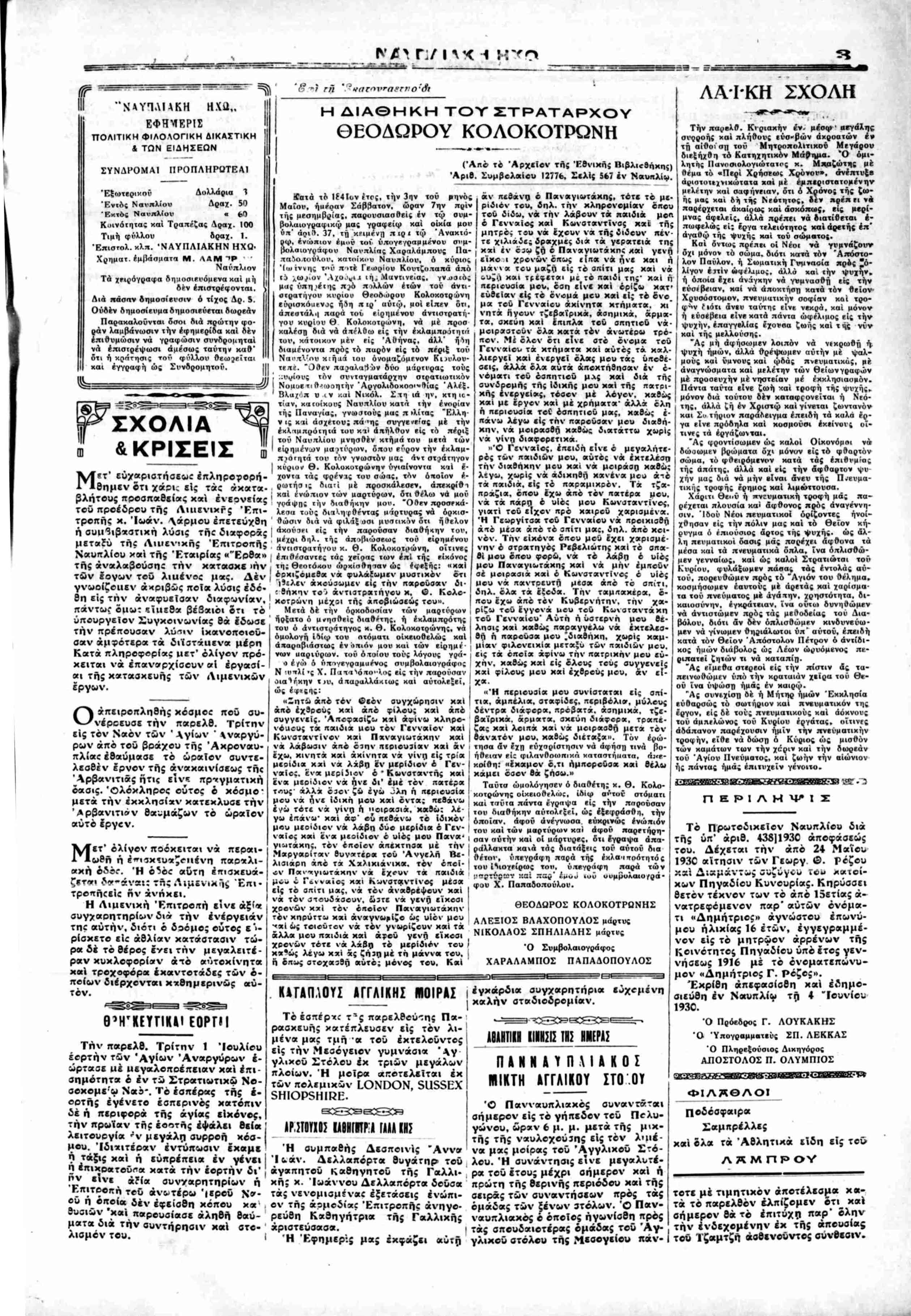 Εφημερίδα «Ναυπλιακή Ηχώ», φύλλο αναδημοσίευση της υπ΄ αριθμόν 12.776/ 03-05-1841 διαθήκης του Συμβολαιογράφου Ναυπλίου Χ. Παπαδόπουλου
