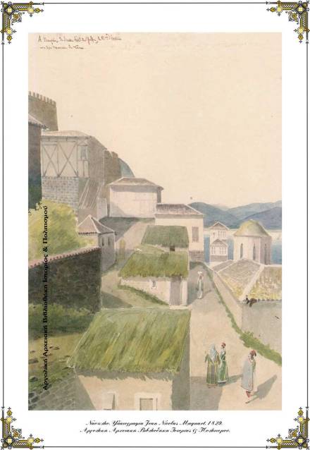 Ναύπλιο. Αποτυπώνονται ενδιαφέροντα στοιχεία αρχιτεκτονικής, όπως οικίες με «ξυλόπηκτη τοιχοποιία» στον όροφο, κεραμιδοσκεπές και χορτοσκεπές. Σημαντικά είναι τα πρόσωπα και οι ενδυμασίες τους, ενώ διακρίνεται καθαρά ο τρούλος της Αγίας Σοφίας. Ίσως πρόκειται για τη σημερινή οδό Ζυγομαλά με οπτική τον αργολικό κόλπο και τη Λέρνη. Υδατογραφία του Ζαν Νικολά Μακάρ (Jean Nicolas Maquart), 1829. Δημοσιεύεται στο: «Το ταξίδι του Συνταγματάρχη Jean Nicolas Maquart στην επαναστατημένη Ελλάδα (Πελοπόννησος 1828-1831)» – Γεώργιος Η. Κόνδης – Yves Ollivier.