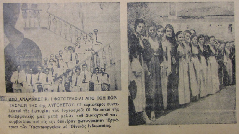 «Δύο αναμνηστικαί φωτογραφίαι από τον εορτασμόν της 4ης Αυγούστου. Οι κυριώτεροι συντελεσταί της επιτυχίας του εορτασμού: Οι Μουσικοί της Φιλαρμονικής μας μετά μελών του Διοικητικού των συμβουλίου και εις την δευτέραν φωτογραφίαν Εργάτριαι των Υφαντουργείων με Εθνικάς ενδυμασίας»