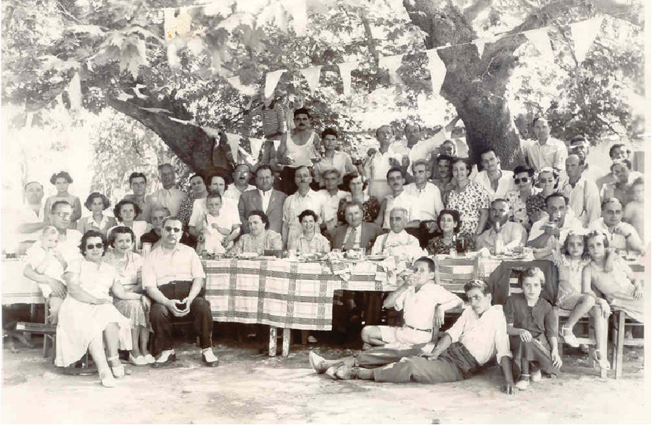 Χαρακτηριστική φωτογραφία των εργαζομένων της επιχείρησης Δ. Μαρίνου στα Δερβενάκια κατά την εορτή της εικόνας των Αγ. Αναργύρων, προστατών της επιχείρησης (αρχές 1970).